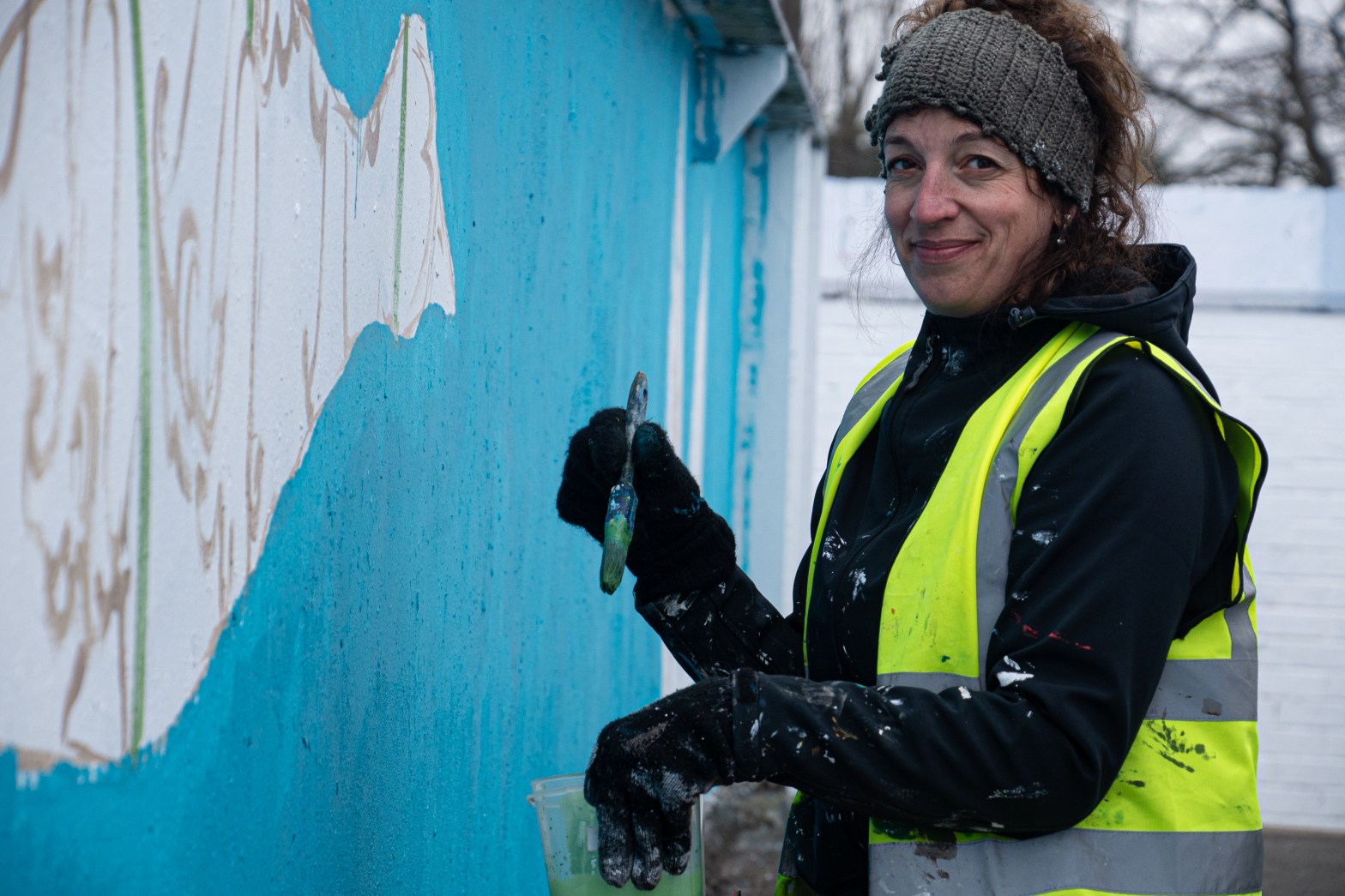 We’ve really enjoyed seeing Emma working on her Love Lane Bridge Mural which was also commissioned by National Rail. Elly from the Arts Team lives locally so she managed to stop by one day and take some socially distanced photographs of Emma in action. Emma say’s of the Love Lane Bridge project…