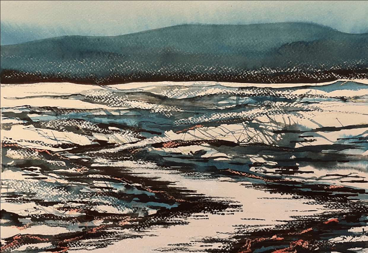 Her current work is inspired by the world around her and incorporates collage, acrylics, watercolour and inks. Drawing is a fundamental part of her practice, as is experimenting with different techniques to achieve layered and unusual effects. It is rare that she sticks to just one medium.